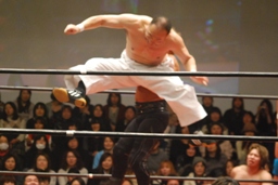 高尾延髄蹴りはかわされるが、ロープに飛んだ石井にカウンターのドロップキック(右写真)、高木にタッチ。5分経過。
