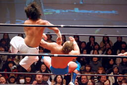 松永ロープに振る、高尾フライングエルボー(右写真)。
