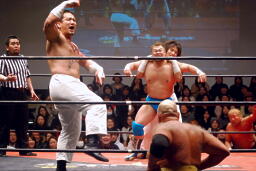 斉藤と松永が高尾にダブルのクローズライン(左写真)。斉藤ボディスラム、誕期にタッチ。