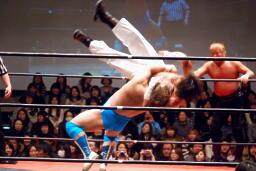 斉藤ロープに飛ぶ、越中カウンターのジャンピングヒップアタック(左写真)、青柳にタッチ。
