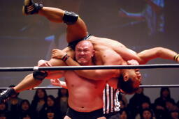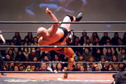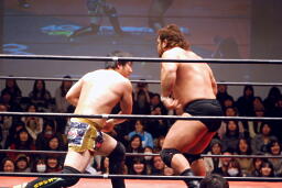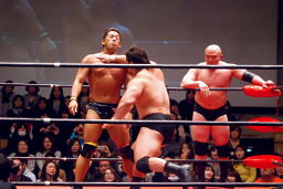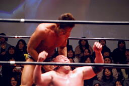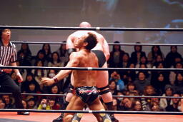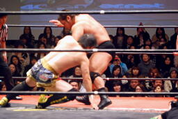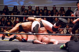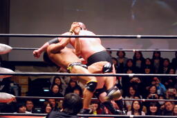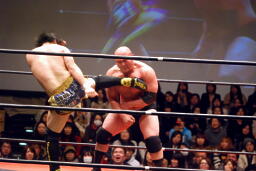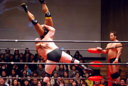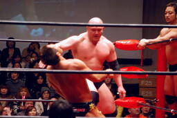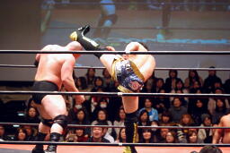 関本と岡林はクイックタッチで代わる代わるマイケルをボディスラム(左写真)。関本がカバー、カウント2。再度カバー、カウント2。もう一度、カウント2。岡林にタッチ。5分経過。