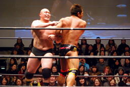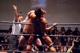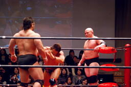 佐藤タックル(右写真)、バック取る。関本ヘッドロックからフライングメイヤー、佐藤はヘッドシザーズでブレーク。両軍タッチ。
