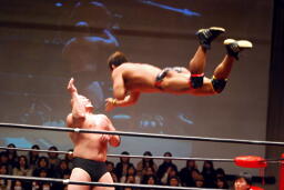 岡林ボディスラム、関本がコーナーに上ってダイビングボディプレス(右写真)、