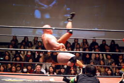 続いて岡林がゴーレムスプラッシュ(左写真)、カウント3。