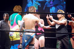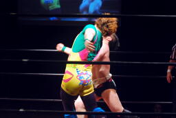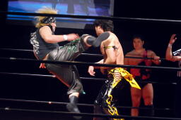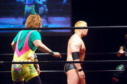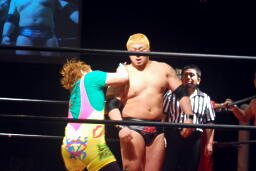 日の逆水平連打、チョーク攻撃、ウラノにタッチ。ウラノ低空の延髄蹴り、ジャックナイフに固めるがKUDOがカット。ウラノコーナーに振って突っ込む、大石カウンターのエルボー、ウラノかわす。ウラノロープに飛ぶ、大石ランニングエルボー(左写真)、KUDOにタッチ。10分経過。