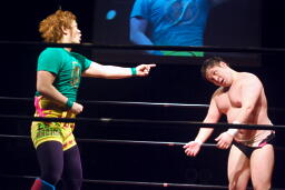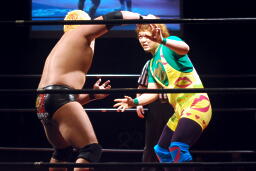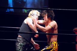 パーフェクトプレックス狙うがアントンはブロックしてパンチ連打(右写真)。アントンはDDT狙うが福田はトップロープをつかんで回避。
