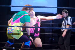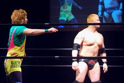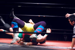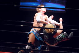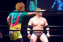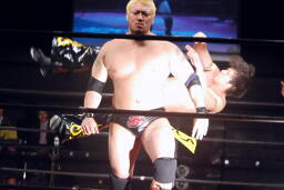 ウラノ首投げからサッカーボールキック、フェースカット。アントンが入ってボディスラム、ウラノがエプロンからシルバーブレット(右写真)、アントンカバー、カウント2。アントンニースタンプ、カウント2。火野にタッチ。