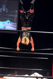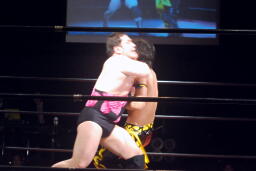 福田ロープに飛ぶ、火野カウンターの逆水平(右写真)。福田コーナーに逃げ帰りKUDOにタッチ。火野もアントンにタッチ。