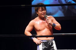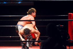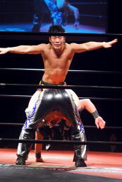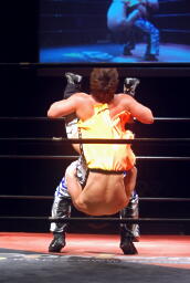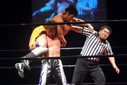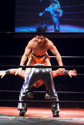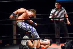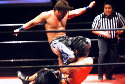 エプロンに出てスワンダイブプレス(左写真)、カウント2。