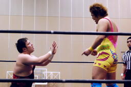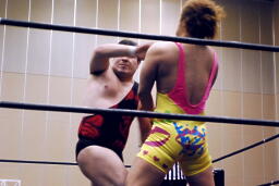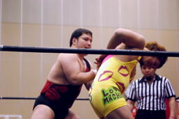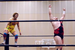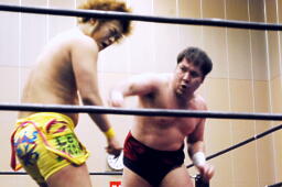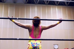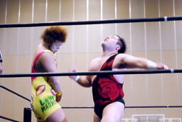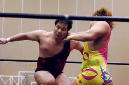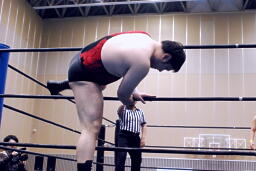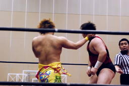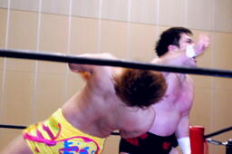 アントンパンチ、ヒザ蹴り、対角線コーナーに振る。アントンは両手を上げてアピールするが、福田はすでにセカンドコーナーに上っており(右写真)、