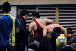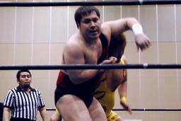 福田追いかけるがアントン捕まえて場外を引き回す(左写真)。主に福田応援団のいるところで乱闘。