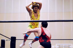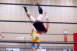 福田パンチ、ニーリフト(左写真)、勢い付き過ぎて自分もひっくり返る。