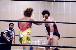 アントン福田の顔面をターンバックルにぶつけようとするが福田はブロック(左写真)、