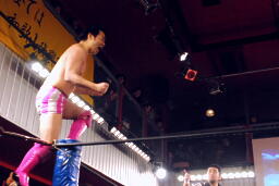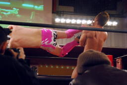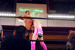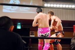 塩田ロープに振ってドロップキック(右写真)、スナップスープレックス、カウント2。塩田ロープに振る、マイケルブロック。塩田が強引にロープに振るとマイケルはスピアーで返す。