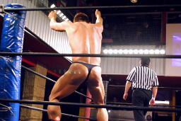 マイケルはコーナーに上るとダイビングショルダーブロック(左写真)、カウント2。