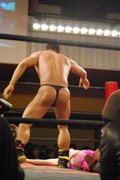塩田が起き上がったのでマイケルはスウィート・チン・ミュージック、塩田キャッチ(左写真)。マイケル急所打ち。