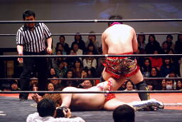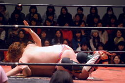 そして大阪でレフェリーストップを奪ったヒールホールドに、ディーノは松井レフェリーにキス(右写真)、驚いてハネ飛んだ松井レフェリーが佐藤に激突して力が緩む、ディーノそのスキにロープ。15分経過。
