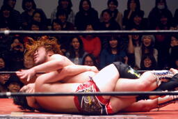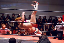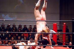 コーナーに上ってリバースえび反りジャンプ(左写真)、カウント2。