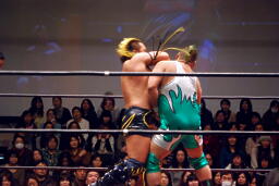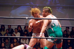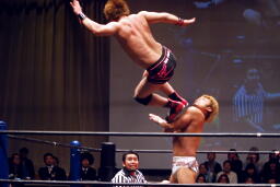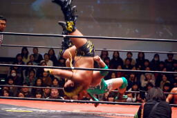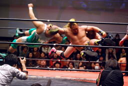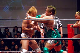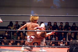 石井切り返して腕ひねる(右写真)、カズ切り返す、石井切り返す、カズはカニばさみで倒してスリーパーからヘッドロック。石井立ち上がってロープに振る、カズショルダーブロック。カズロープに飛ぶ、石井カウンターのドロップキック。両軍タッチ。