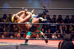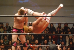 入江再度肩に担ぐ、近藤着地してスリーパー、入江はバックドロップに(右写真)。