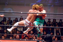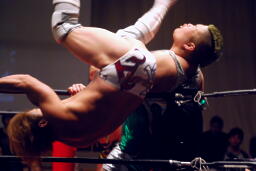 石井とカズエルボーの打ち合い(左写真)、石井再度ダブルアームDDT狙うがカズはブロック。