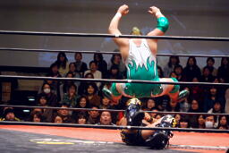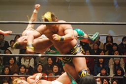 石井ドロップキック、ボディスラム、入江がコーナーからダイビングボディプレス(左写真)。