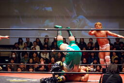 入江エルボー(右写真)、カズは顔面キック。カズ場外に落とす。近藤が場外ブレーンバスター、リングに戻す。5分経過。
