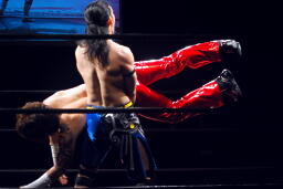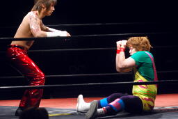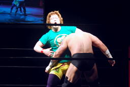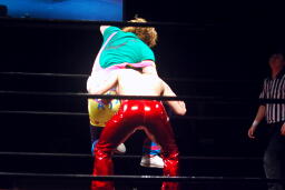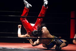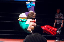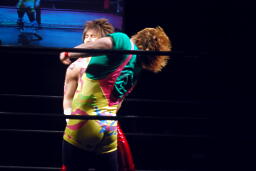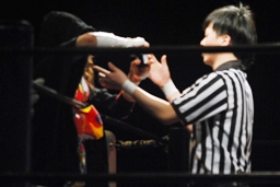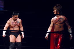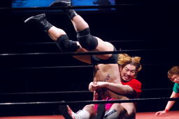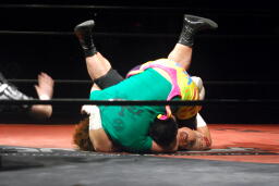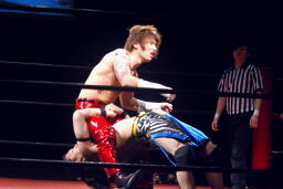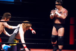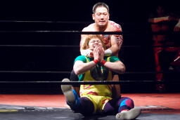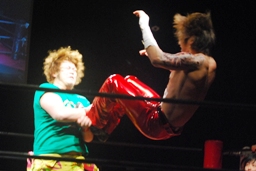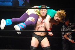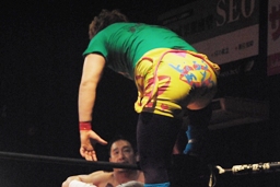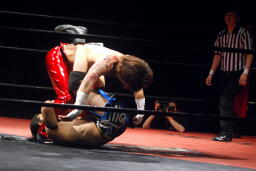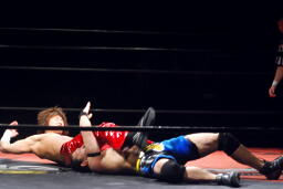 彰人コーナーに振る、高尾切り返して突っ込む、彰人かわしてスクールボーイ、立ち上がると低空ドロップキック、高尾かわす。彰人下からエビに丸め込み(左写真)、