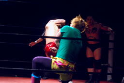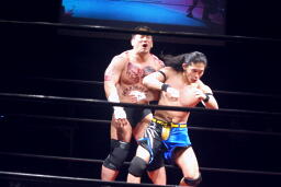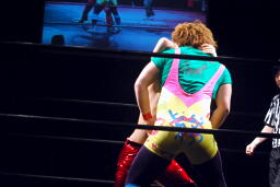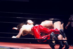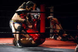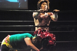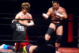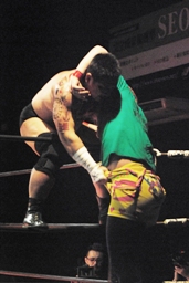 高木ガット書っ戸連打、首投げからチンロック(左写真)、リリースしてエルボースタッブ、カウント2。ボディスラム、高尾にタッチ。