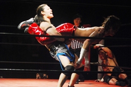 ロープ際の福田に高尾が外に飛び出すドロップキック(右写真)。