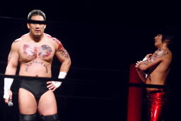 彰人ボディスラム、ストンピング。高木が入るが彰人は高木にバックエルボー(左写真)。