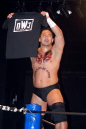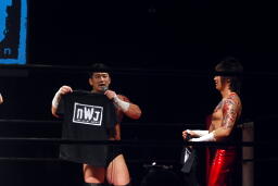 しかし高木「こういうこともあろうかと思ってな、俺は新しいユニットを立ち上げた!反体制と言えば日本では維新軍、アメリカではnWo。俺はその2つをミックスした!見ろ!」スクリーンには「nWJ」の文字(右写真)。まさかの「new World Japan」に会場には「やられた」感が充満。