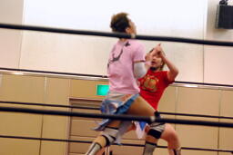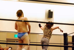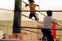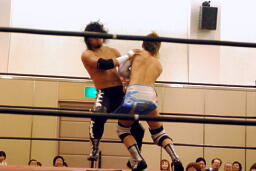 再度十字ロープワーク、今度はアームドラッグの打ち合い(右写真)、ドロップキックは相打ちに。