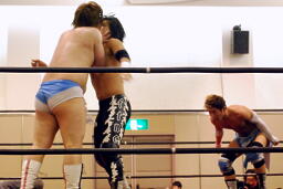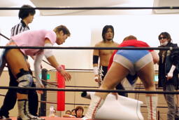 佐々木が大石を羽交い絞め、ニラがロケットパンチに行くが大石かわして佐々木に誤爆(右写真)、大石はディーノにタッチ。