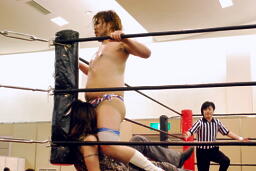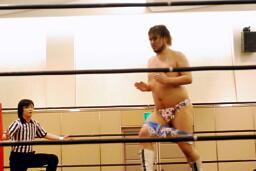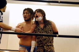 佐々木「グーで殴るぞ!」と宣言してナックル連打(左写真)、ロープに振ってドロップキック、カウント2。5分経過。