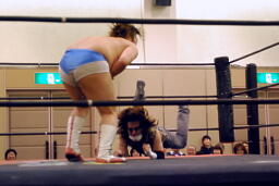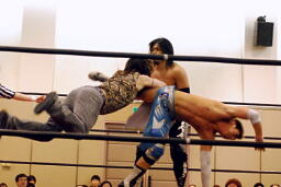 ディーノをリングに戻すとニラがDJタイム(右写真)。これによりディーノのアバラとニラの背骨が折れたらしい。