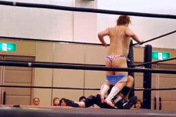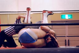 ディーノ「挑発してるのか?後悔させてやる。」とアンダータイツをずらしてニラの顔面に座る(左写真)、カウントは2。