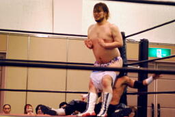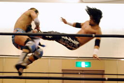 大石パンチ連打、ロープに飛んでフライングエルボー?佐々木はドロップキックで撃墜(右写真)。