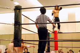 佐々木がコーナーに上る、大石がディーノを引きずり出し、2人で「飛んでみろよ!お前の飛ぶことに対する意気込みはそんなもんか!」と挑発(右写真)