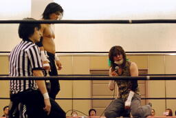 木曽レフェリー「いいえ、アイツらは大変な物を盗んでいきました。お客さんの心です。」言い終わるとダッシュで逃げる木曽レフェリー(左写真)。そのまま休憩に。