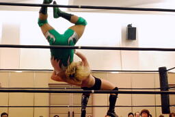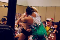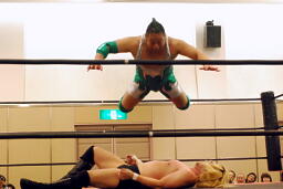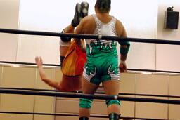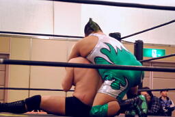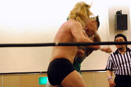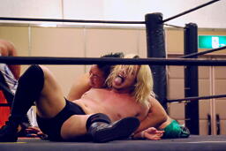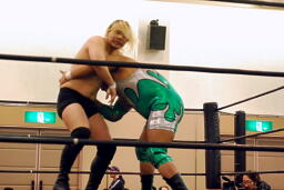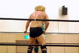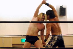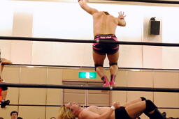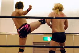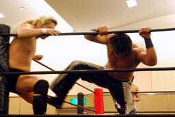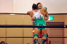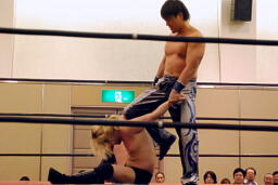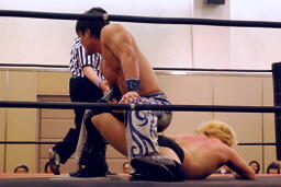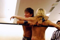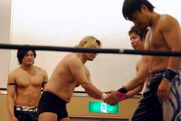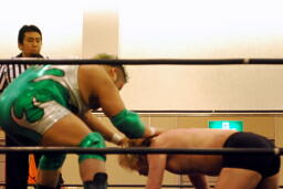 手四つ、石井腕をひねる(右写真)、高梨切り返す、石井返す、高梨切り返す、石井バック取る、高梨腕をひねる、石井切り返す、高梨切り返してハンマーロックからヘッドロック、フライングメイヤー。石井はヘッドシザーズでブレーク。KUDOとHARASHIMAにタッチ。
