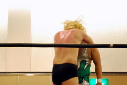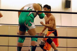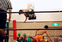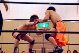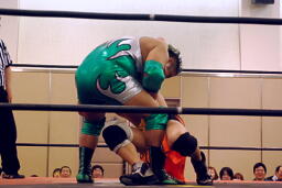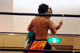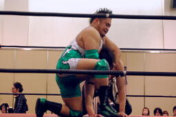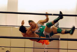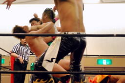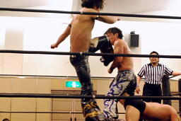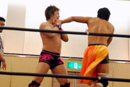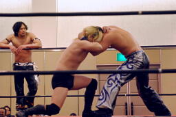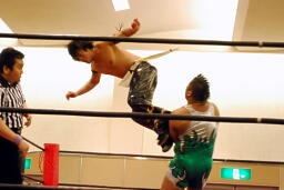 KUDOタックル(右写真)、HARASHIMAなんとかネックロックに。HARASHIMAバックに回る、KUDO首を取る、HARASHIMA切り返す。両者立ち上がる、KUDOコーナーに押し込んで大家にタッチ。