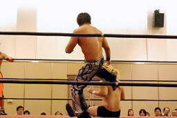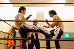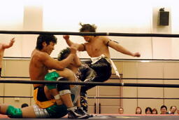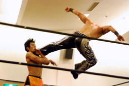 石井ロープに振ってヒップトス、サマーソルトドロップ狙うがKUDOかわす。KUDOスクールボーイで転がして立ち上がったところにキック(右写真)。大家にタッチ。大家ボディスラム、カウント2。5分経過。