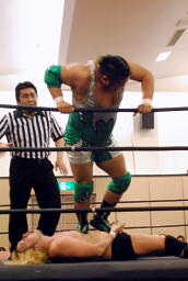 石井エルボースタッブ、ボディスラムからダブルフットスタンプ(右写真)、カバーはKUDOがカット。石井大家を場外に出す。