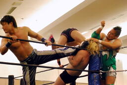 リングに戻すと3人で攻撃(右写真)。石井カバー、カウント2。HARASHIMAにタッチ。