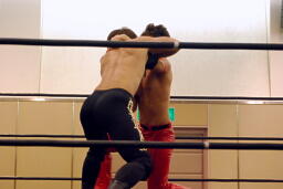 高尾ヘッドロック(右写真)、遠藤ロープに振ろうとするが高尾は振らせない。