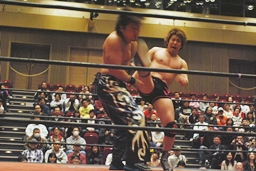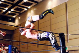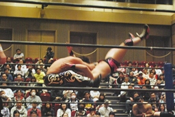 佐々木再度NOW or NEVER狙う、石井着地するとスタンガンでターンバックルにぶつける(左写真)。投げっ放しジャーマン、カバー、カウント2。15分経過。