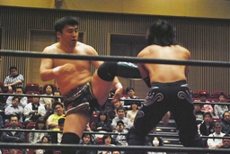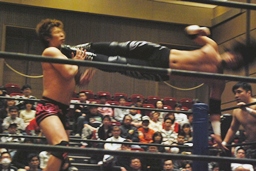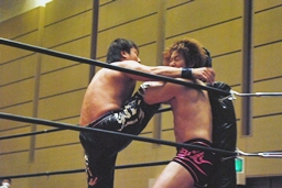 佐々木ドロップキック(右写真)、HARASHIMAにタッチ。