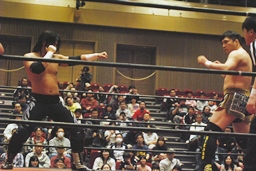 石井ストンピング、エルボー(左写真)。佐々木もエルボー打ち返す。