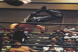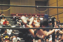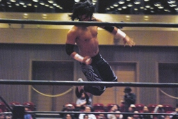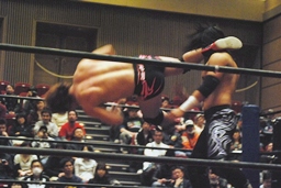 コーナーに上ってダイビングエルボードロップ(右写真)、石井かわす。
